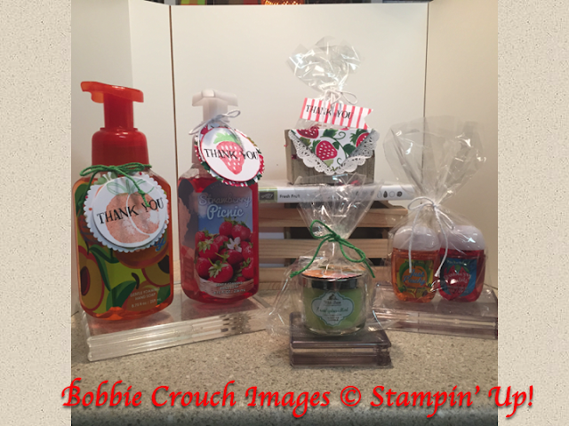 I wanted to share with you some cute ideas using the Fresh Fruit stamp. If you don’t own this set I suggest you add it to your wish list! It has so many great possibilities and uses. I made these cute teacher thank you gifts. I got my two hand soaps, and the mini candles at Bath & Body Works for 75% off this past weekend!