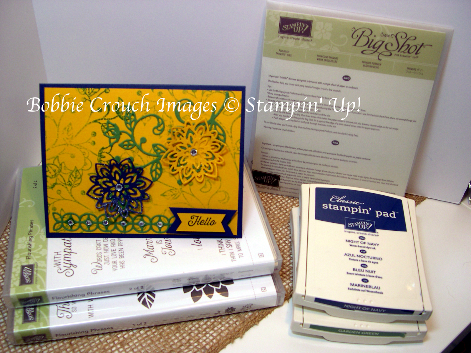 I have another cute card for you today. This card was made using the Flourishing Phrases stamp set and thinlits. I love the Night of Navy, Curshed Curry, & Garden Green cardstick combo together.