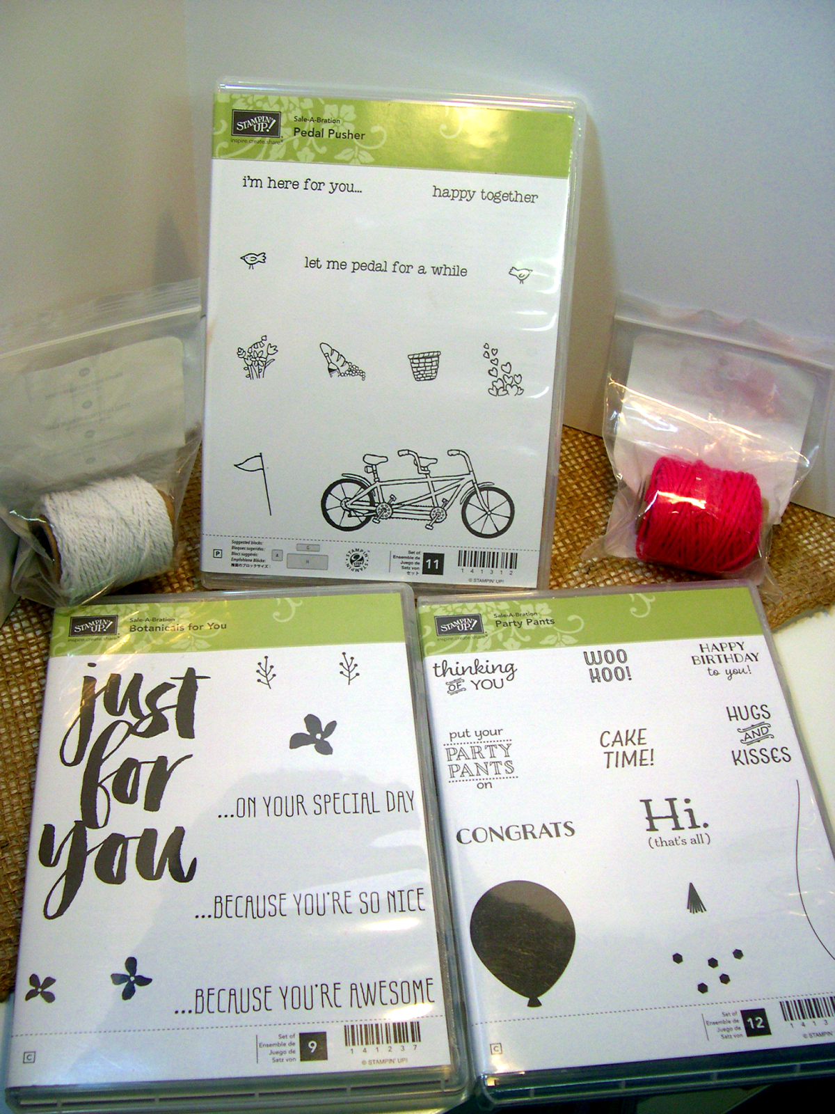 It’s time for another great giveaway. I have 3 Sale A Bration stamp sets from last years catalog. They are no longer available. These are brand new, never used. You will also win the white and melon mambo bakers twine. Good luck!