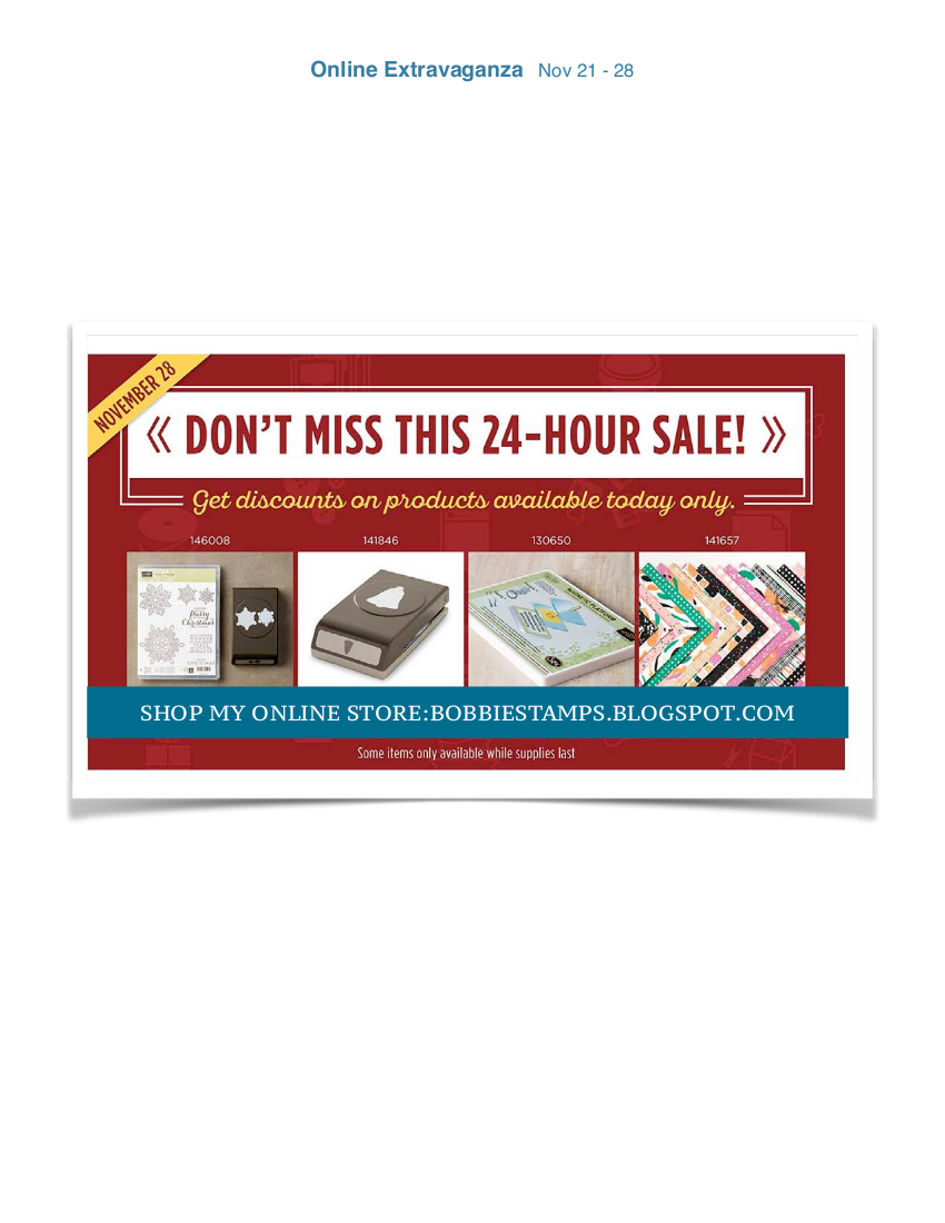 November 22, 2016 / Leave a comment Online Extravaganza I have a new list that is easier for you to read and see what items are on sale. Let the shopping begin! CLICK HERE TO SHOP Hugs & much love, Bobbie