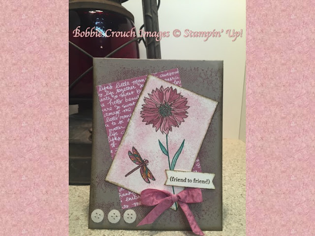 This is one I made for a friend. I love how the dragonfly turned out using the different colors. Looks like a baby dragonfly for our new 2017 Occasions catalog Dragonfly Dreams stamp set!