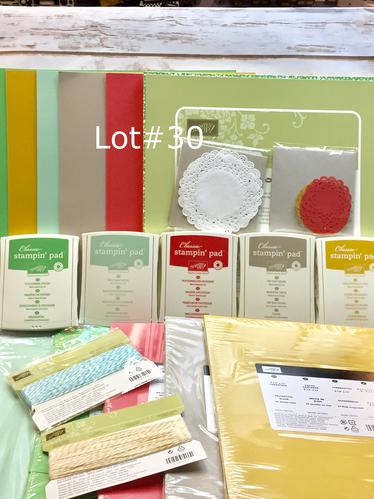 Lot#30 Delightful Dijon 8.5×11 Cardstock Used but full Tip Top Taupe 8.5×11 Cardstock Used but full Watermelon Wonder 8.5×11 cardstock New Cucumber Crush 8.5×11 cardstock Used and very little in pack Mint Macaron 8.5×11 Used very little in pack Delightful Dijon Ink Pad Tip Top Taupe Ink Pad Watermelon Wonder Ink Pad Mint Macaron Ink Pad Cucumber Crush Ink Pad 2015-2017 In Color Doilies New White tea Lace doilies New Crushed Curry Bakers twine-Used Bermuda Bay Twine-New 2015-2017 In Color 12×12 DSP I am also including all my scrap cardstock for these colors in this lot.
