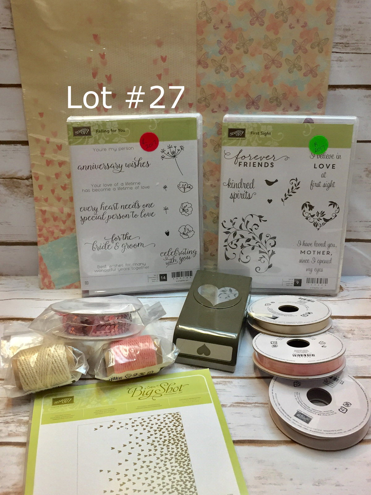 Lot #27 Falling in Love 12×12 DSP-Used Falling for You Clear Mount Stamp Set-Used First Sight Clear Mount Stamp Set-Used Sweet Heart Punch Falling Petals Embossing Folder Blushing Bride Sequin Trim-Used Very Vanilla Bakers Twine-Used Blushing Bride Bakers Twine-New Very Vanilla Satin Ribbon-Usd Blushing Bride Stitched Satin Ribbon-New Very Vanilla Stitched Satin Ribbon-Used $50.00 Plus $13.60 S&H