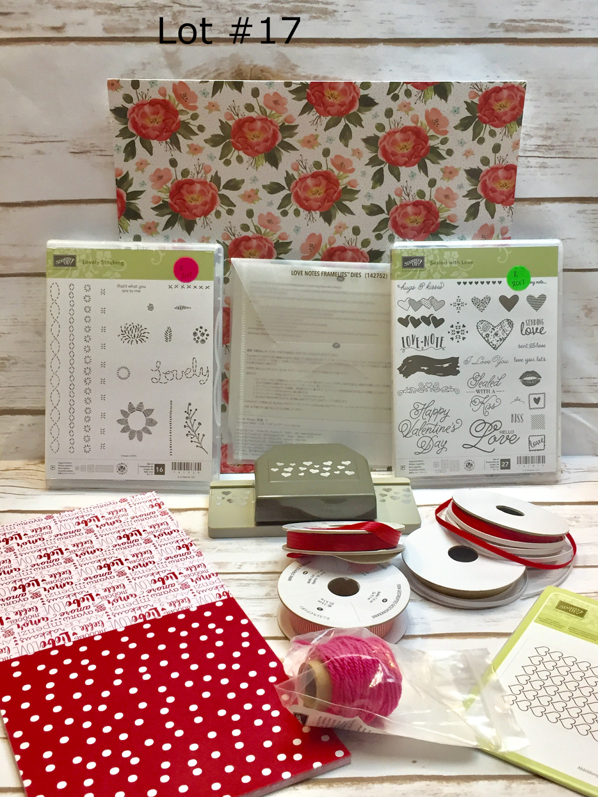 Lot #17 Birthday Bouquet 12×12 DSP Lovely Stitching Stamp Set-New-Photopolymer Sealed with Love Stamp Set-Photopolymer-Used Sending Love 6×6 DSP Paper Pack-Used Happy Heart Embossing Folder Sending Love Ribbon Combo Pack-Used Real Red Satin Ribbon-Used Watermelon Wonder Stripped Ribbon-Used Melon Mambo Thick Bakers Twine-Used Heart Punch $50.00 Plus $13.60 S&H