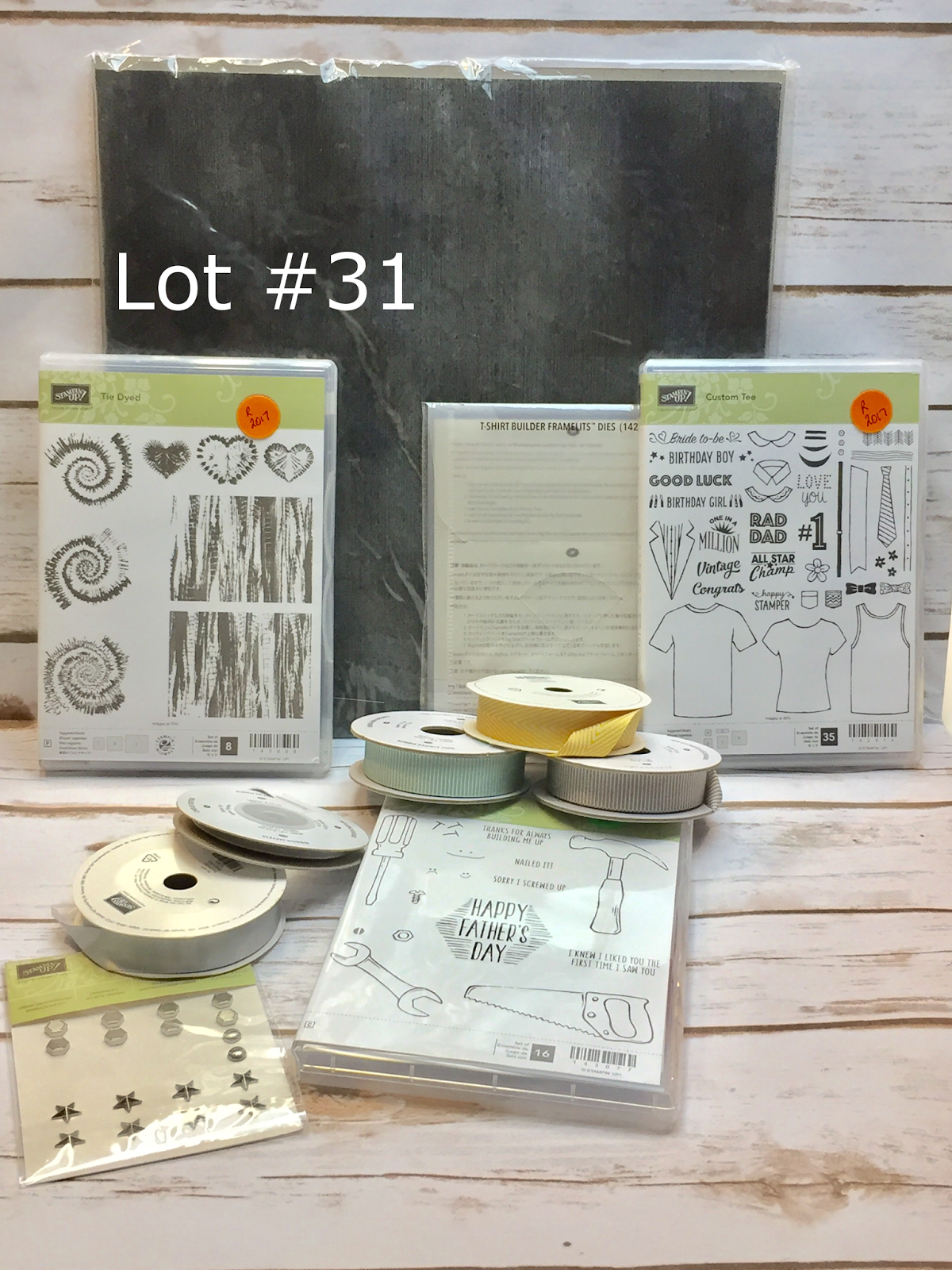 Lot #31 Custom Tee Photopolymer Stamp Set-New T-Shirt Builder Framelits Nailed It Clear Mount Stamp Set-Used Tie Dyed Photopolymer Stamp Set-Used 12×12 Urban Underground DSP Urban Underground Embellishment Kit -Used Silver Satin Ribbon-Used but full Smoky Slate Taffeta Ribbon-Used Mint Macaron Mini Stripped Ribbon-Used but full Crushed Curry chevron ribbon-Used but full Tip Top Taupe Mini Chevron Ribbon-Used but full $60.00 Plus $13.60 S&H