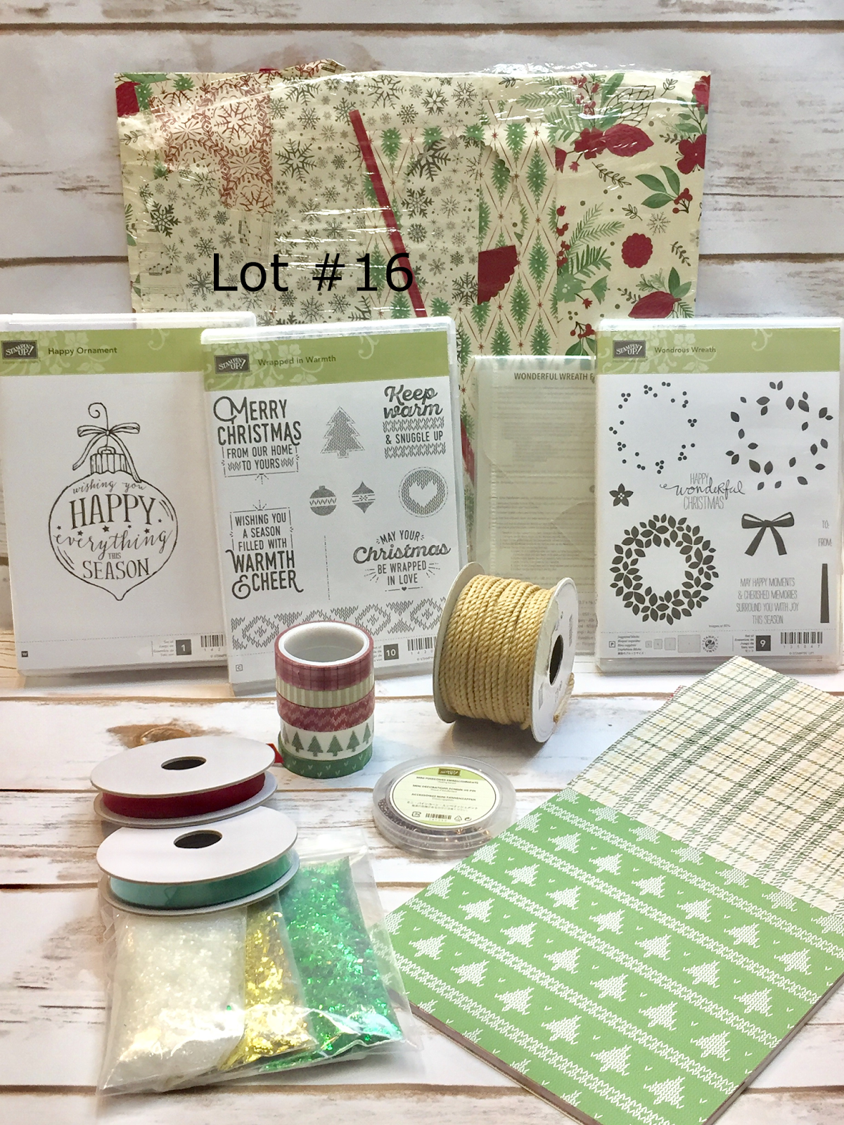 Lot #16 This Christmas 12×12 DSP-Used Wrapped in Warmth Stamp Set-Clear Mount-Used Happy Ornament Stamp Set-Wood Mount-Used Wondrous Wreath Stamp Set-photopolymer-new Wonderful Wreath Framelits Warmth & Cheer 6×6 DSP Paper Stack Warmth & Cheer Washi Tape-Used Mini Pinecones-Used Mica Flakes-New Kraft Rope-Used Silky Taffeta Ribbon-one used, one new