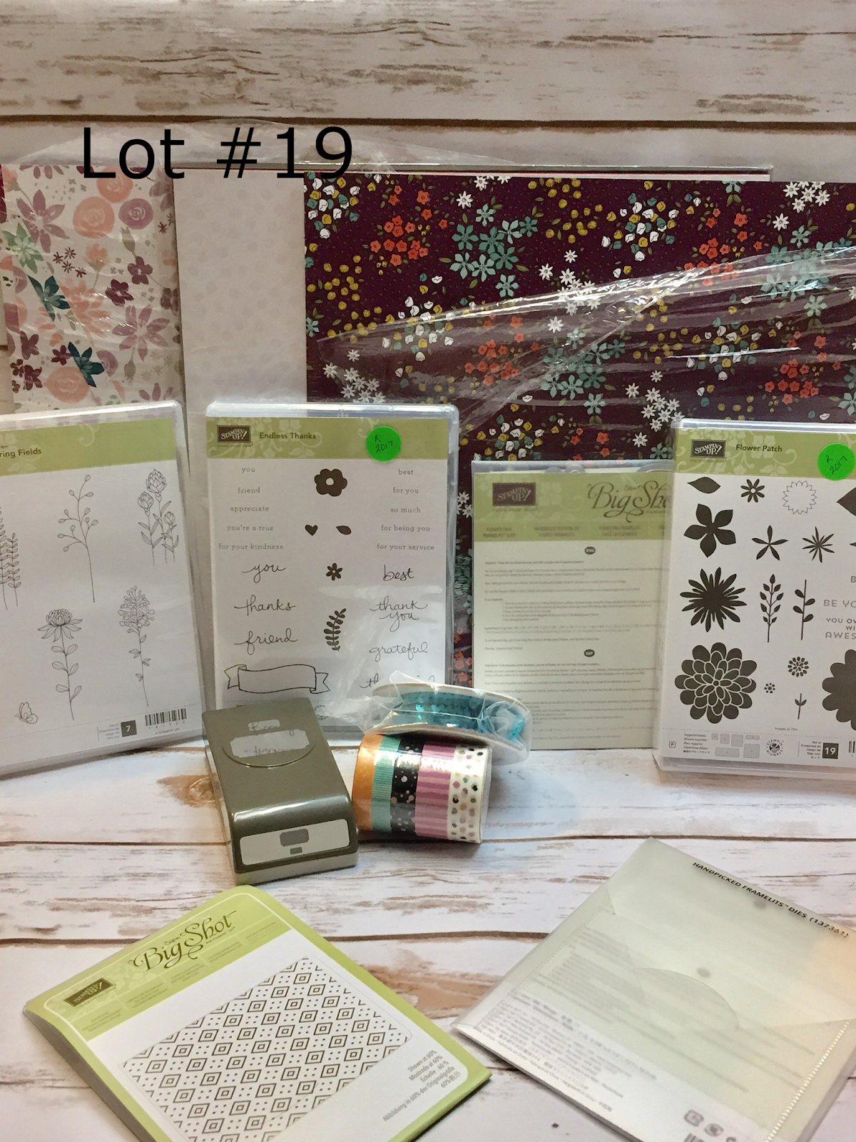 Lot #19 Blooms & Bliss 12×12 DSP-Used Color Me Irresistible 12×12 DSP-New Wildflower Fields 12×12 DSP-Used Endless Thanks Stamp Set-Photopolymer-Used Flowering Fields 2016 SAB Stamp Set-New-Clear Mount Flower Patch Stamp Set-Photopolymer-Used Flower Fair Framelits Handpicked Framelits Boho Chic Embossing Folder Playful Pallette Washi Tape-new Bermuda Bay sequin Trim-Used Ticket Punch