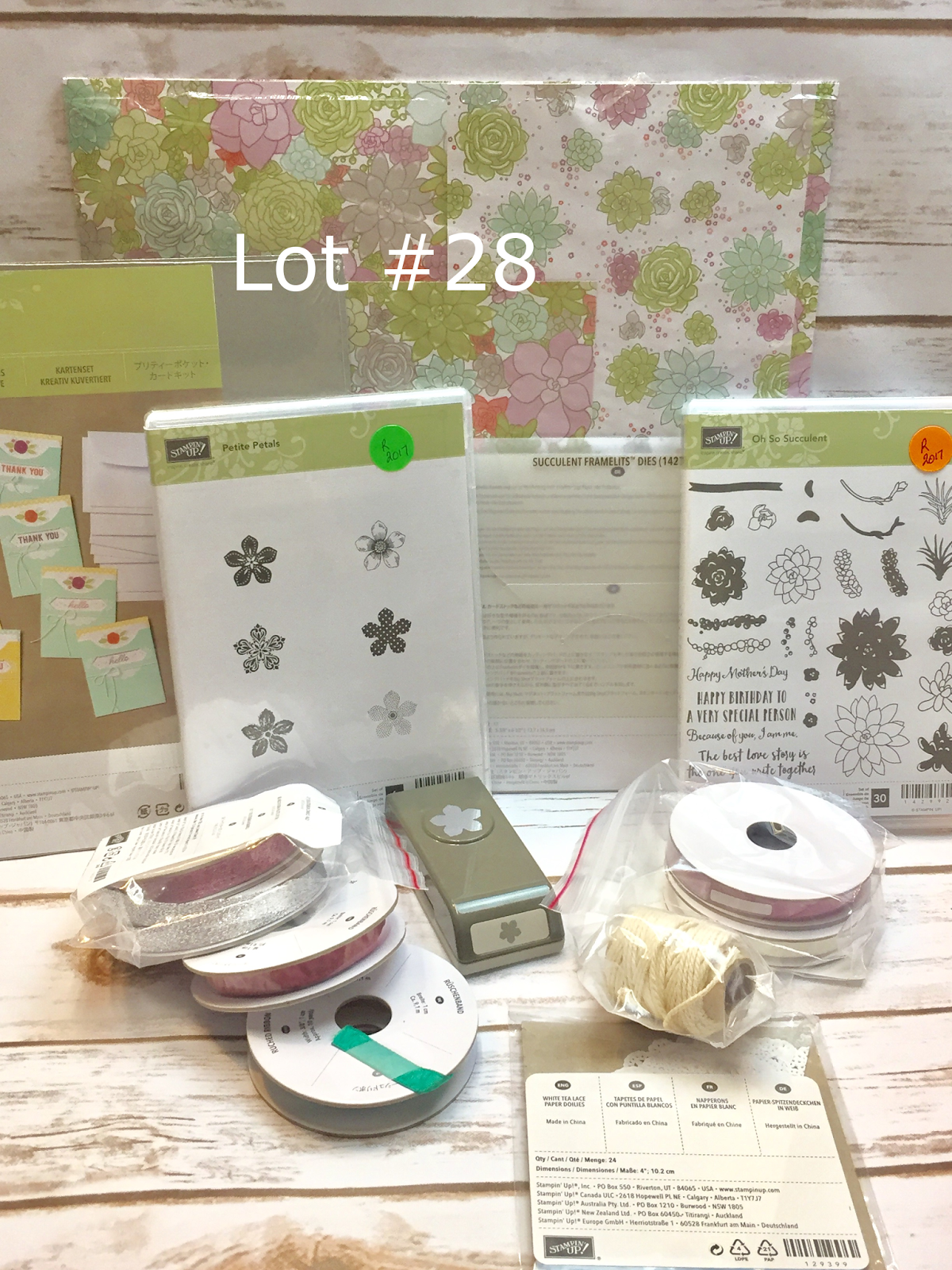 Lot #28 Petite Petals Clear Mount Stamp Set-Used Petite Petals Punch Oh So Succulent Photopolymer Stamp Set-Used Succulent Framelits Pretty Pocket Card Kit Very Vanilla Bakers Twine-Used Glitter Ribbon Combo Pack-Used Sweet SugarPlumb Ruched Ribbon-New Emerald Envy Ruched Ribbon-Used Succulent Ribbon Combo Pack-New White Tea Lace Doilies-Used Succulent 12×12 DSP $50.00 Plus $13.60 S&H