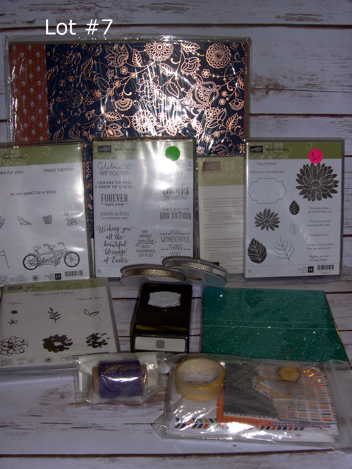 Lot #7 Special Reason Stamp Set Clear Mount-Used Stylish Stems framelits dies Suite Sayings -Clear Mount-Used Pedal Pusher-New SAB 2016 What I Lover Photoploymer- Used Petals & Paisleys12x12 DSP Used Glimmer paper 6×6 2017 SAB Metalic Ribbon 2017 SAB New Elegant Eggplant Thick Bakers Twine- New Punch (not sure of the name) Project Life Happiness Is Kit $50.00 Plus $13.30 S&H