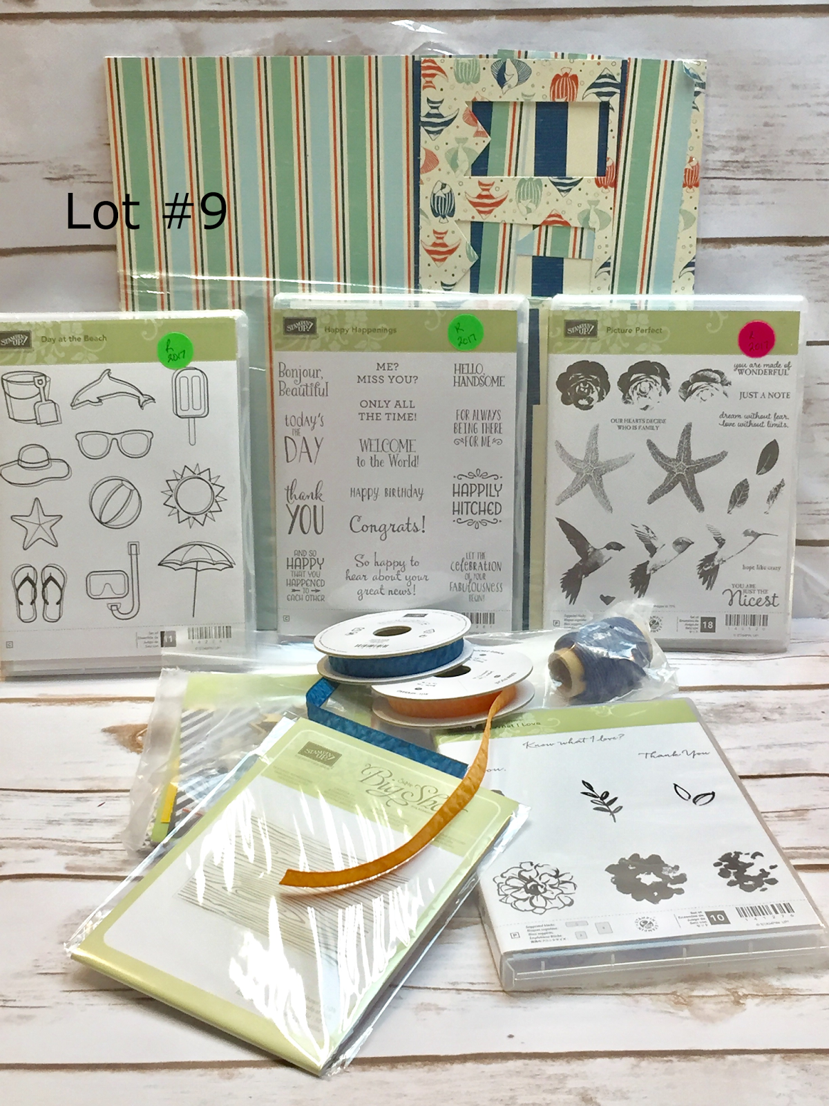 Lot #9 Day at the Beach Stamp Set-Clear Mount-New What I Love SAB 2016-Used-photopolymer Happy Happenings-Clear Mount-Used Picture Perfect-Photopolymer-used Woodgrain Embossing Folder Project Life card kit- Everyday Adventure Dapper Denim Ruched Ribbon-used but very full Peekaboo Peach Ruched Ribbon-Used-but very full Night of Navy Thick Bakers Twine-Used By the Shore 12×12 DSP-used-9 full sheets left in the pack $50.00 Plus $13.60 S&H