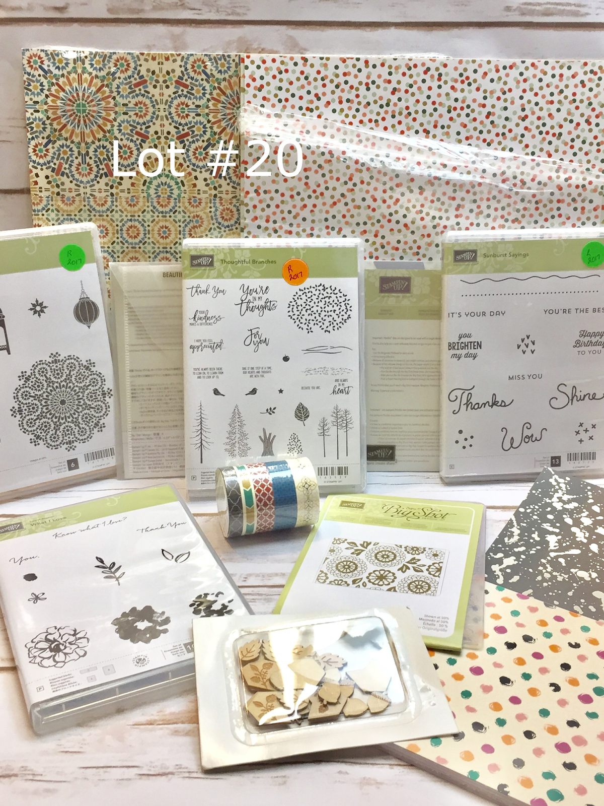 Lot #20 Gold Soiree 12×12 Speciality DSP-Used Moroccan 12×12 DSP-Used Moroccan Nights Stamp Set-Clear Mount-Used Thoughtful Branches Stamp Set-Used-Photopolymer Beautiful Branches Thinlits Sunburst Sayings Stamp Set-Clear Mount-Used Sunburst Thinlits What I Love 2016 SAB Stamp Set-Photopolymer-New Playfull Pallette 6×6 DSP Paper Pack-Used Moroccan Nights Washi Tape-New Lovely Lace Embossing Folder Into the Woods Elements-Used $60.00 Plus $13.60 S&H