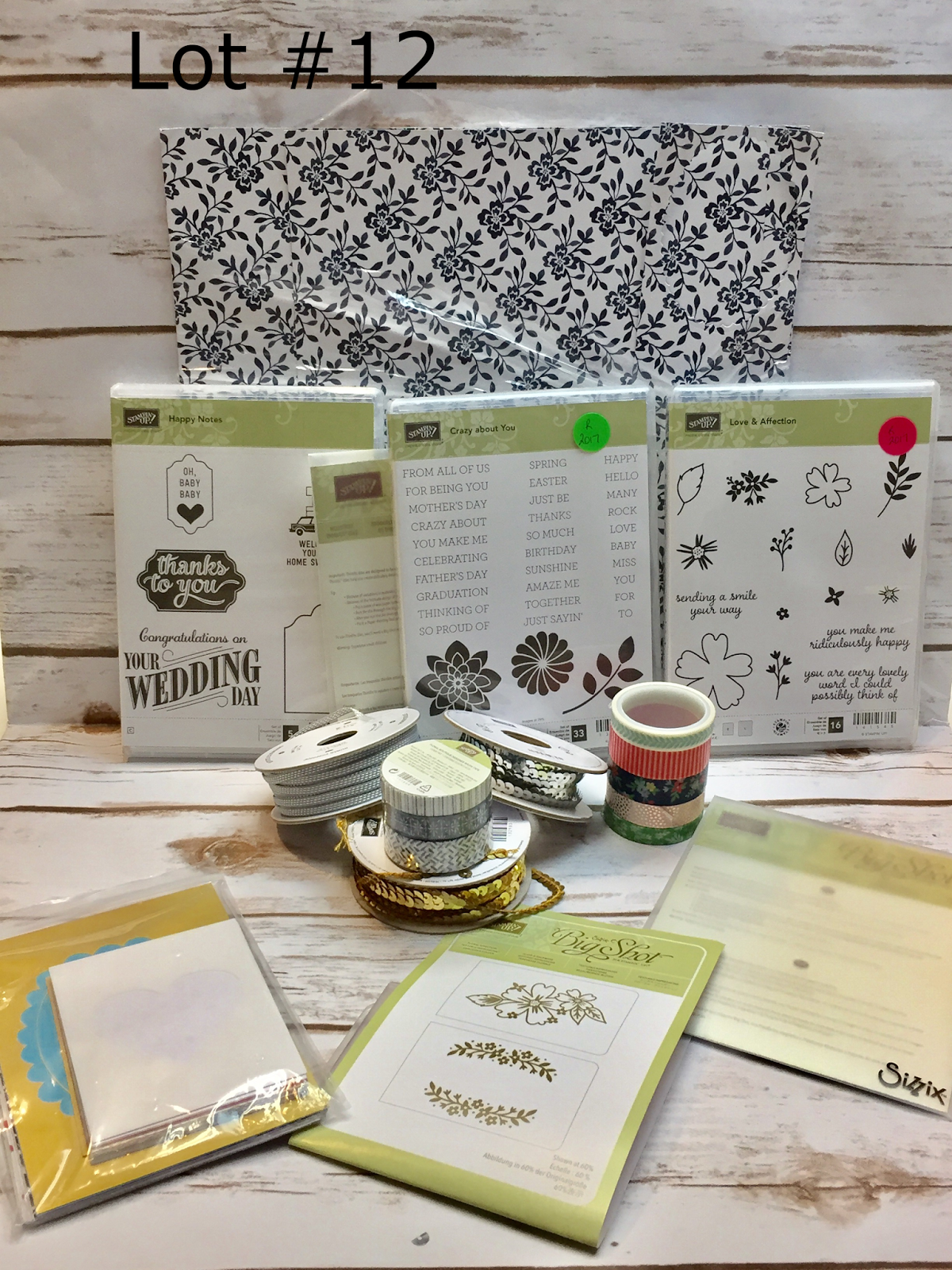 Lot#12 Floral Boutique 12×12 DSP-Used-9 full sheets left Crazy about You Stamp Set-photopolymer-Used Love & Affection Stamp Set-photopolymer-Used Happy Notes-Clear Mount-New Tags & Labels Framelits Floral Affection Embossing Folder Project Life Memories in the Making Affectionately Yours DSP Washi Tape Floral Boutique DSP Washi Tape Silver Sequin Trim-used Gold Sequin Trim-Used Smoky Slate Stitched Ribbon Used-but full