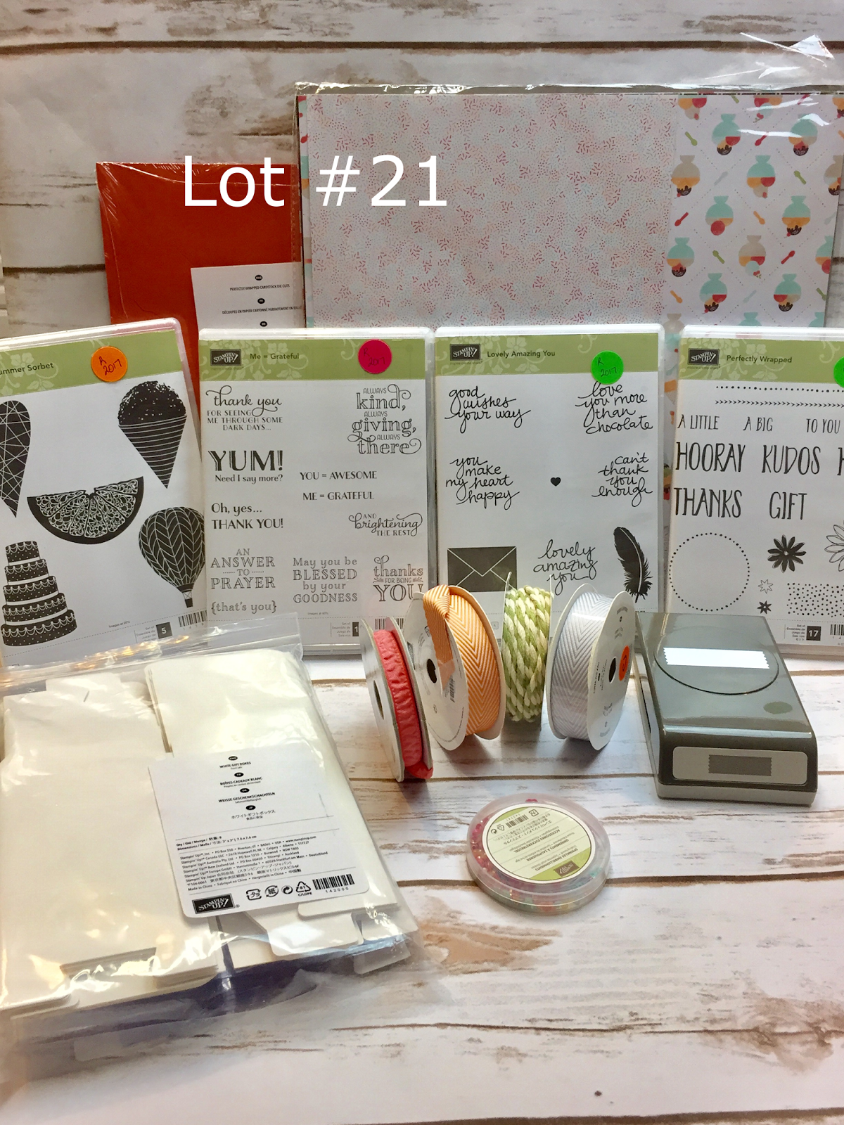 Lot #21 Tasty Treats 12×12 DSP Perfectly Wrapped Die Cuts Lovely Amazing You Stamp Set-photopolymer-New Perfectly Wrapped Stamp Set-Photopolymer-Used Me=Greatful Stamp Set-Clear Mount-Used Summer Sorbet Stamp Set-Used Clear Mount White Gift Boxes-Used Sprinkles Embellishments-New Washi Label Punch Smoky Slate Chevron Ribbon-New Natural & Old Olive Two Tone Trim-Used Pumpkin Pie Chevron Ribbon-Used Flirty Flimango Ruched Ribbon-Used $50.00 Plush $13.60 S&H