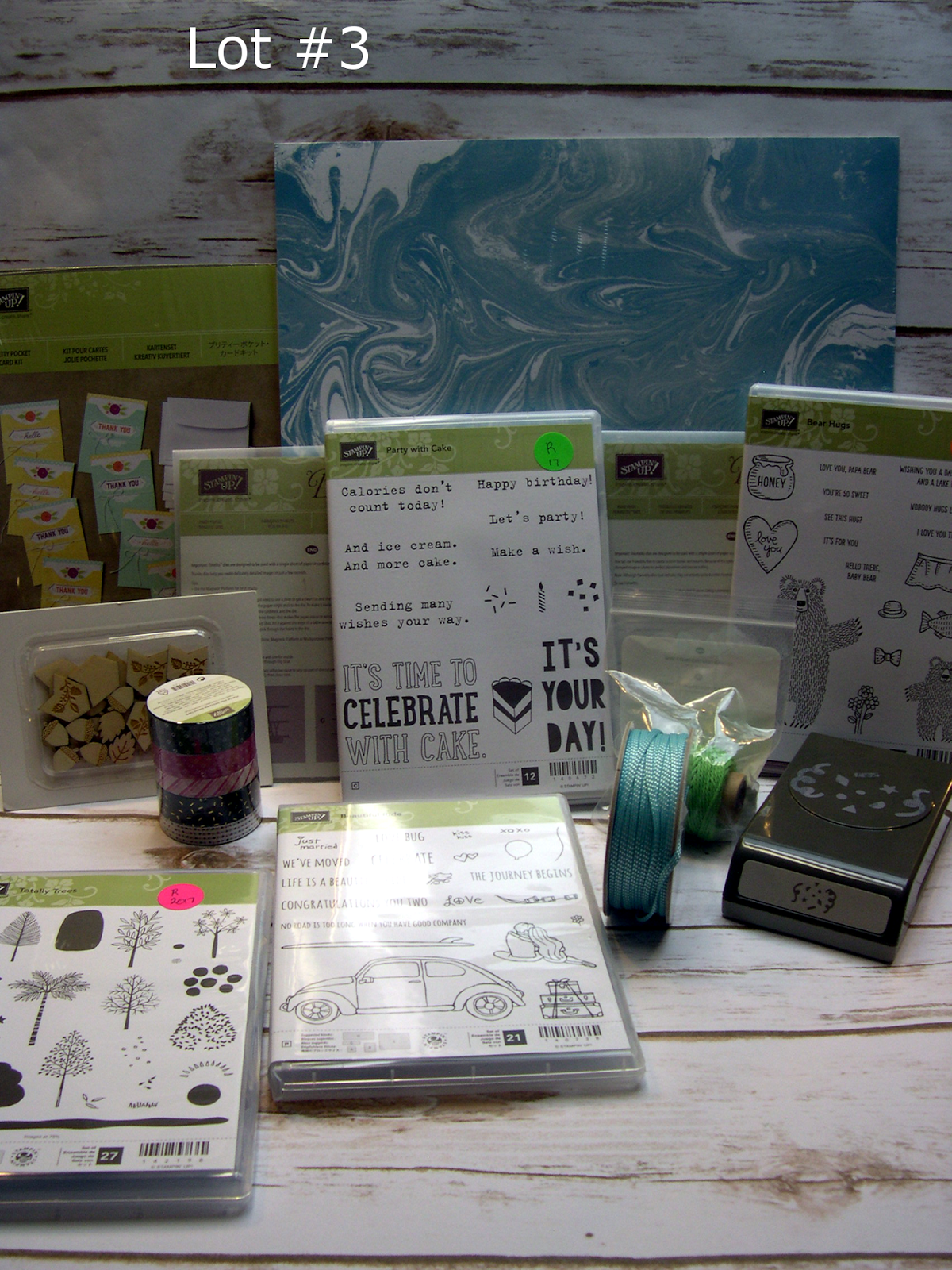 Lot #3 Beautiful Ride stamp set-used Totally Trees stamp set-used Party with Cake stamp set-used Bear Hugs Clear Mount with Framelits-Used Confetti Punch Bermuda Bay stitched Ribbon-used Pop of PInk Washi Tape-New Into the Woods Elements-New Cucumber Crush Bakers Twine-new Pretty Pocket Card Kit Perfectly Artistic DSP $75.00 Plus $13.60 S&H
